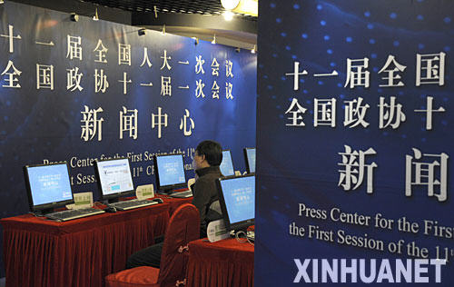 2月27日,新聞中心提供寬帶上網服務。 十一屆全國人大一次會議和全國政協十一屆一次會議將分別于3月5日和3月3日在北京開幕。記者獲悉,設在北京西長安街北側梅地亞中心的兩會新聞中心已于26日正式啟動,中心工作人員開始接待和安排中外記者采訪會議。 新華社記者 戴旭明攝