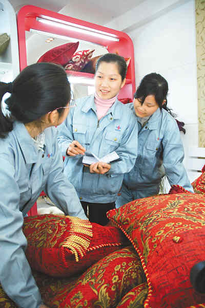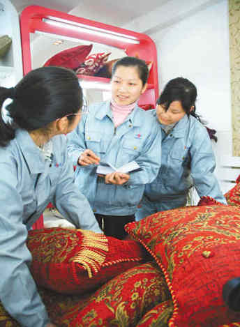 浙江代表團的楊曉霞代表是寧波市外來務(wù)工明星之一。圖為進京前,楊曉霞代表(中)來到姐妹們中間,傾聽大家的心聲。孫曉青 丁繼敏攝影報道