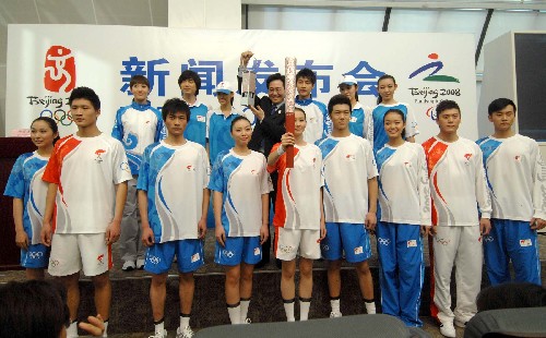 1月16日,模特在展示火炬接力服裝。當日,北京奧運會火炬接力形象景觀在北京奧運新聞中心公布。北京奧運會火炬接力形象景觀以奧運五環、火炬接力標志、主題口號、核心圖形和色彩為基礎元素,以鳳紋、祥云、中國紅為創意來源,充分體現奧林匹克精神與中國文化的結合,具有強烈的時代特色。 新華社記者 羅曉光 攝
