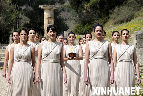 3月22日,扮演最高女祭司的瑪利亞·娜芙普利都在彩排儀式上點燃火種罐。當日,希臘奧林匹亞再次舉行北京奧運會圣火采集儀式彩排,并成功試采到新的火種。 新華社記者 吳曉凌攝
