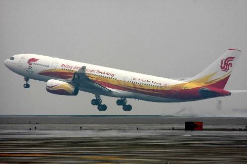 4月1日,“奧運圣火號”飛機起飛。當日,北京奧運圣火搭乘專機離京,正式踏上以“點燃激情、傳遞夢想”為口號的全球傳遞之旅。新華社發(fā)(魏萌攝)