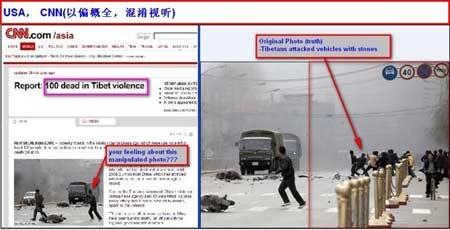 3月17日,CNN網(wǎng)站上使用了一張拉薩事件的圖片,圖中兩輛軍車正向兩名平民駛來--事實(shí)上,如果完整展示圖片的話,可以看到當(dāng)時(shí)軍車旁有約10名暴徒在向軍車投擲石塊,顯然CNN網(wǎng)站的圖片故意剪裁了暴徒向軍車投擲石塊的圖像。