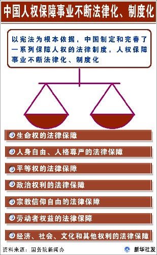 聲明說,尊重和保障人權是中國政府和中國人民矢志不渝追求的崇高目標和堅定奉行的憲法原則!皣易鹬睾捅U先藱唷庇2004年寫入了憲法,已成為以人為本的科學發展觀和構建社會主義和諧社會的重要組成部分,成為國家建設和社會發展的重要主題。