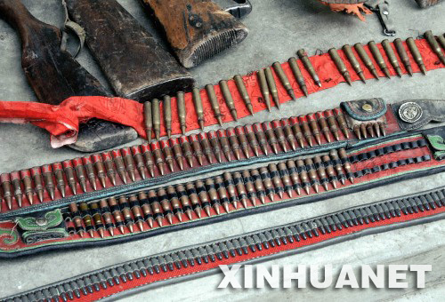4月3日,國務院新聞辦舉行集體采訪,邀請四川省阿壩藏族羌族自治州人民政府副州長肖友才,就3月16日阿壩縣發生的一些不法分子在縣城進行打砸搶燒的暴力犯罪事件回答中外記者提問。肖友才指出,不久前阿壩縣城發生的打砸搶燒事件,是達賴集團精心策劃、有組織的暴力破壞活動的重要組成部分。 這是根據群眾舉報,公安機關在格爾登寺查獲的武器彈藥(3月28日攝)。 新華社發