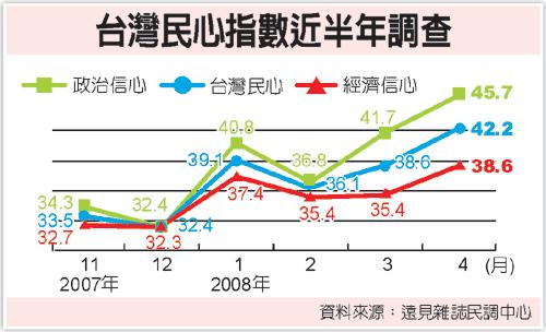 據臺灣《經濟日報》報道,由臺灣《經濟日報》與《遠見雜志》合辦的“臺灣民心指數”調查發現,馬英九、蕭萬長在3月份臺灣地區領導人選舉中取得壓倒性勝利,島內民心指數也呈現上揚的走勢,4月份達42.2點,但仍在“有失民心”的階段。不過,在馬英九陸續釋出開放大陸游客、兩岸包機等“利多”信息下,島內民眾對未來臺灣政治穩定度與兩岸關系的改善存有相當高的期待。