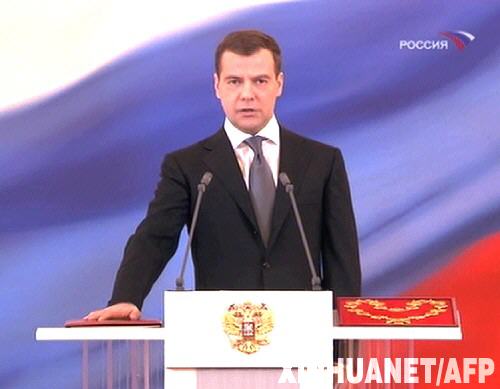 這張5月7日俄羅斯RTR電視臺的電視截圖顯示,梅德韋杰夫當天在莫斯科宣誓就任俄羅斯聯邦總統。 新華社/法新