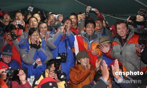 5月8日,北京奧運(yùn)圣火成功登頂珠峰,在珠峰大本營內(nèi)觀看直播的中外記者以及工作人員興奮異常。 中新社發(fā) 盛佳鵬 攝