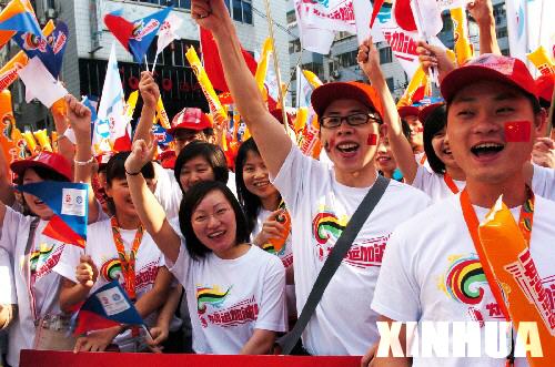 5月11日,福州市民為奧運圣火傳遞歡呼雀躍。當日,北京奧運圣火傳遞活動在福建省福州市舉行。 新華社記者張生貴攝