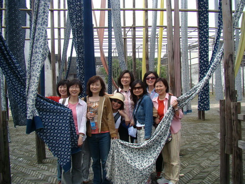 在富有江南特色的藍印花布前留影成為臺灣媽媽們的最愛(程娟娟拍攝)