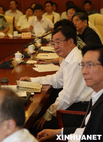 5月19日,受胡錦濤總書記委托,中共中央政治局常委、中央紀委書記賀國強趕赴重慶察看地震災情,慰問受災干部群眾,看望奮戰在抗震救災第一線的部隊官兵、公安民警和醫護人員,指導協調抗震救災工作。 這是賀國強聽取重慶抗震救災工作簡要匯報,與大家共同研究探討以后的救災工作。 新華社記者劉衛兵攝