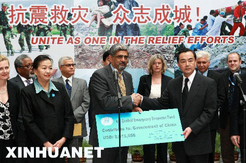 新華網(wǎng)北京5月21日電(記者 榮燕 孫奕) 21日下午,中國外交部副部長王毅在北京代表中國政府接受了聯(lián)合國向四川地震災(zāi)區(qū)捐贈的800萬美元緊急人道主義援助。