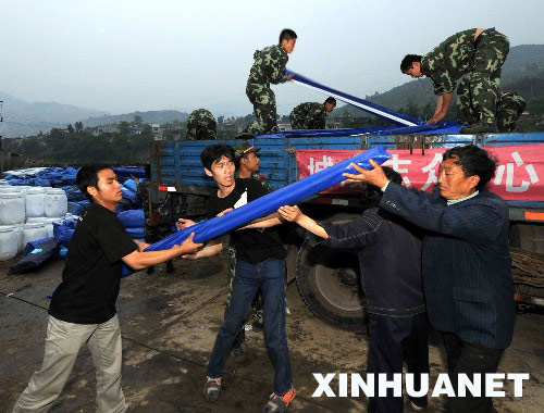 5月20日,工作人員在搬運救災(zāi)帳篷。當(dāng)日,首批聯(lián)合國捐贈的320頂帳篷運抵四川汶川水磨鎮(zhèn)。 新華社記者 高潔 攝