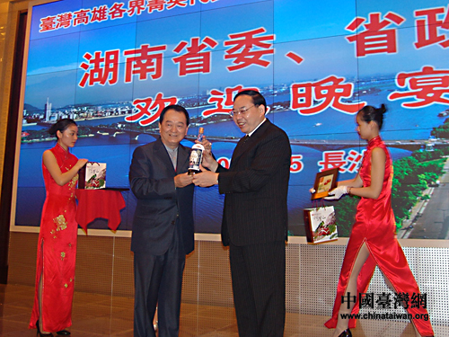 湖南省委副書記梅克保(右)與高雄各界菁英參訪團(tuán)團(tuán)長李厚業(yè)互贈禮物,再續(xù)湘臺情。(攝影 董潔)