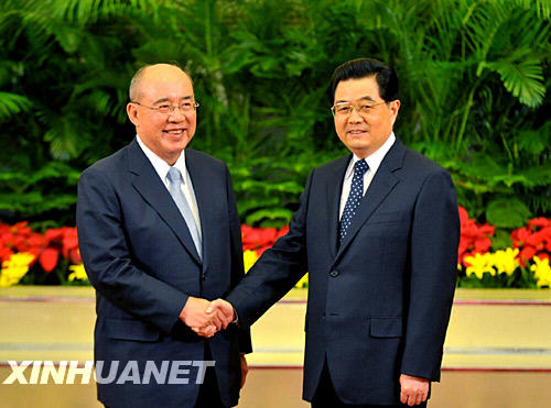 5月28日,中共中央總書記胡錦濤在北京人民大會堂迎賓廳會見中國國民黨主席吳伯雄和他率領的中國國民黨大陸訪問團全體成員。這是胡錦濤同吳伯雄親切握手。 新華社發(李舸攝)