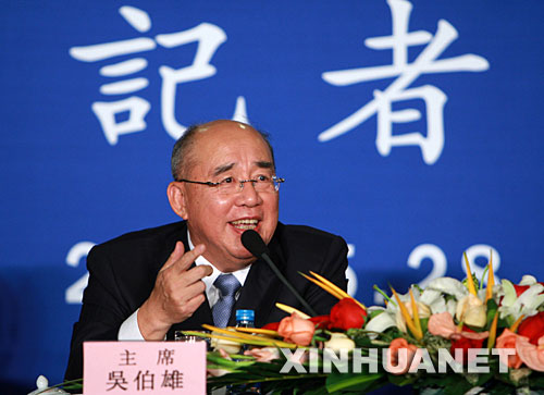 5月28日,中國國民黨主席吳伯雄回答記者提問。當日,中國國民黨大陸訪問團在北京舉行記者會。 新華社記者 龐興雷 攝
