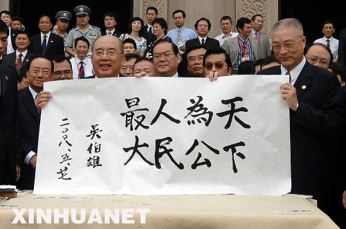 也許是受到四周人們熱情的激勵,吳伯雄一行僅用約20分鐘就登上了祭堂,過程比人們事先想象的輕松得多。祭祀完畢,吳伯雄在祭堂前揮毫寫下八個大字:“天下為公,人民最大”。