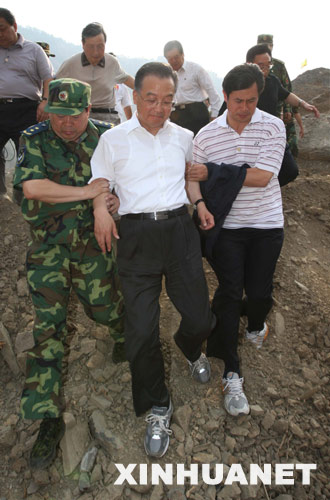 6月5日,中共中央政治局常委、國務院總理、國務院抗震救災總指揮部總指揮溫家寶赴四川察看唐家山堰塞湖的情況。這是溫家寶走在坑洼不平的碎石坡上,實地考察、研究堰塞湖漲水及工程排險辦法。 新華社記者劉衛(wèi)兵攝