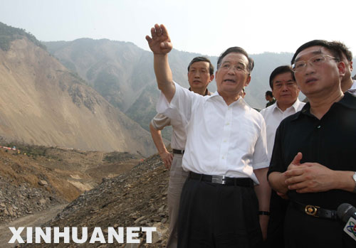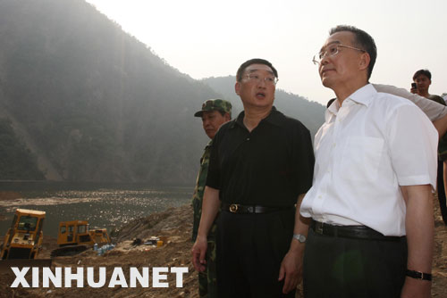 這是溫家寶在察看唐家山堰塞湖導流明渠,了解工程排險等相關情況。 新華社記者劉衛(wèi)兵攝