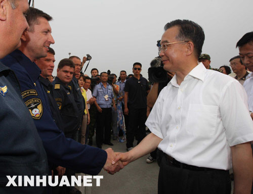 這是溫家寶察看唐家山堰塞湖后,在機場親切看望俄羅斯米-26重型運輸直升機機組成員。 新華社記者劉衛(wèi)兵攝