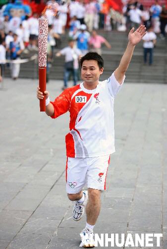 6月6日,第一棒火炬手唐靈生手持火炬傳遞。當日,北京奧運圣火在廣西桂林傳遞。 新華社記者邢廣利攝