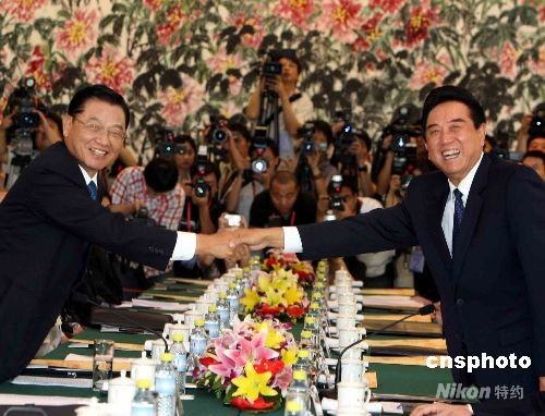 中新網6月12日電 12日上午,海峽兩岸關系協會會長陳云林與臺灣海峽交流基金會董事長江丙坤在北京釣魚臺5號樓緊緊握手,兩會領導人直接啟動了雙方中斷十年的商談,臺灣各大媒體均在第一時間進行詳盡報道并高度評價兩會復談的歷史意義。