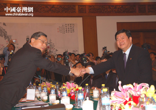 今天上午,海協會與海基會就兩岸周末包機議題進行協商。這是海協會執行副會長孫亞夫與海基會副董事長兼秘書長高孔廉在協商前握手。(攝影:中國臺灣網 田云鵬)