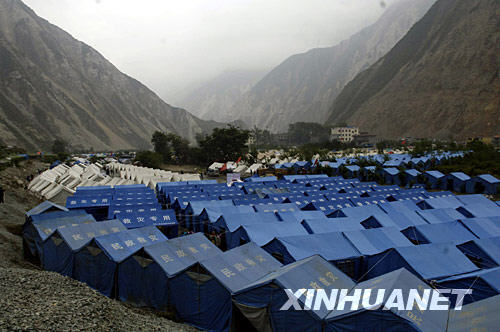 這是6月18日拍攝的汶川縣最大的緊急避險安置點——綿虒鎮板橋村緊急避險安置點。6月18日,四川汶川縣綿虒鎮板橋村安置點安置了5000多名從山上緊急撤離下來的群眾,以防范次生災害的威脅。由于汶川縣緊急避險采取“邊撤退,邊搬遷,先入住,后完善”的方法,這里的設施正在逐步完善,以期達到小區生活標準。 新華社記者 海明威 攝
