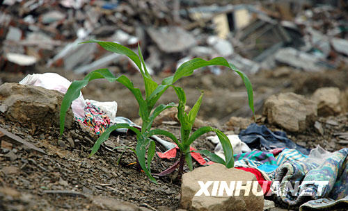 北川縣城廢墟上已經長出玉米苗(6月16日攝)。 新華社記者 王洋 攝