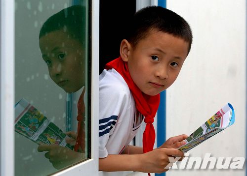 在都江堰市幸福家園安置點,小學生鄧煜銳從活動板房內探出身來 新華網記者 岳月偉 攝