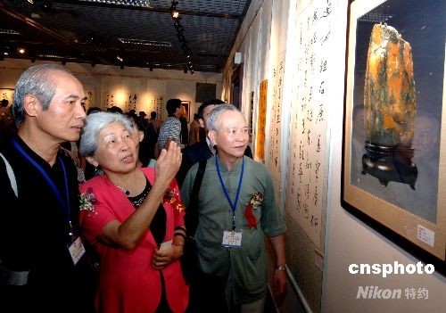 6月19日,由臺灣中國書法家學會理事長謝季蕓女士(左二)率團的臺灣書法界名流二十多人,在福州市博物館內品味海峽兩岸壽山石文化書法精品。當日,海峽兩岸壽山石文化書法精品展在此開幕。 中新社發 劉可耕 攝