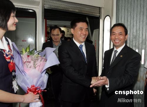 6月23日下午,臺北市長郝龍斌抵達上海浦東國際機場,開始對上海進行為期5天的訪問,這是新中國成立以來,臺北市長首次訪問上海。圖為上海市臺辦主任楊建榮(右)到機場迎接。 中新社發 潘索菲 攝