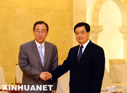 2008年7月2日,國家主席胡錦濤在北京人民大會堂會見來華訪問的聯合國秘書長潘基文。 新華社記者李濤攝