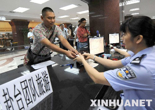 7月1日,張先生成為首位在北京市公安局出入境管理處辦理赴臺游手續的市民。當天,北京市公安局出入境管理處開始為首批314人辦理赴臺旅游的相關手續。入境管理處保證申請人將在7月2日下午前拿到赴臺簽注和《大陸居民往來臺灣通行證》。 新華社記者 李文攝