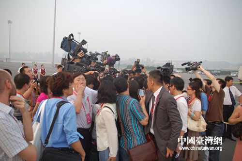 兩岸媒體記者在北京首都機(jī)場(chǎng)3號(hào)停機(jī)坪焦急的等待(攝影:鐘寶華)