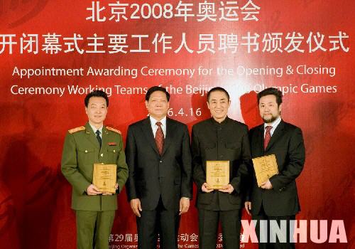 資料圖片:2006年4月16日,北京奧運(yùn)會開、閉幕式創(chuàng)作團(tuán)隊:著名導(dǎo)演張藝謀將擔(dān)任北京奧運(yùn)會開、閉幕式總導(dǎo)演,中國人民解放軍總政歌舞團(tuán)團(tuán)長張繼鋼和國家歌舞團(tuán)副團(tuán)長、藝術(shù)總監(jiān)陳維亞為副總導(dǎo)演。圖為北京奧組委主席劉淇(左二)與張藝謀(右二)、張繼鋼(左一)、陳維亞在聘書頒發(fā)儀式上合影。 新華社發(fā)
