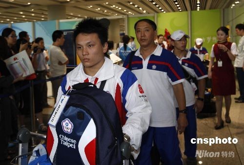 中新網7月31日電 7月31日,中華臺北隊舉重運動員抵達北京首都國際機場。參加北京奧運會的中華臺北舉重隊由7人組成,包括5名運動員和2名教練員。