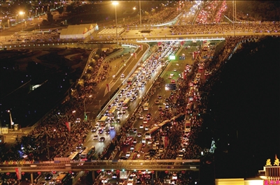 由于鳥巢限行,大量公交車并入主路行駛,主路上的車輛異常擁擠,越靠近鳥巢,車輛行駛越慢,司機(jī)都希望多看一眼絢爛的焰火。在9點(diǎn)至10點(diǎn)之間,陸續(xù)有幾次煙花升起,坐在車?yán)锏某丝投荚谂氖郑l(fā)出尖叫。