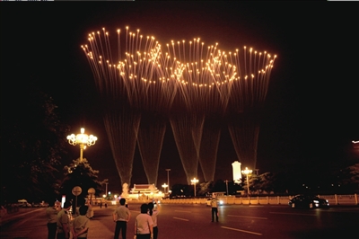 10點(diǎn),天安門廣場(chǎng)南側(cè)、人民英雄紀(jì)念碑前,紅的、綠的、金黃的,一排柱形的禮花形成簾幕,照亮了遠(yuǎn)處的城樓。正陽門南,瞬時(shí)“咚、咚”炮聲大作,怒放的紅牡丹、含蓄的金菊花、藍(lán)紫的水仙、綠的繡球……各種造型的煙火同時(shí)綻放,與北邊的簾幕斗艷。