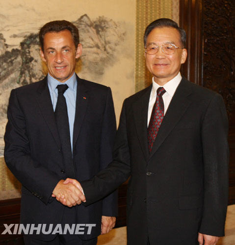 在會見法國總統薩科齊時,溫家寶說,法國是中國在歐盟的重要伙伴。薩科齊總統最近表達了對中國人民的良好祝愿和致力于推動中法全面戰略伙伴關系發展的愿望,我們表示贊賞。中方珍惜兩國和兩國人民之間的合作與友誼,希望中法關系的全面性、戰略性和長期性能夠保持下去。我們愿與法方加強磋商與協調,推動第十一次中歐領導人會晤和第七屆亞歐首腦會議取得積極成果,促進中歐關系和亞歐關系深入發展。