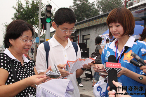 中國臺灣網8月14日北京消息 志愿者的微笑是北京最好的名片!14日,20位來自臺灣的青年學生走上北京街頭志愿者服務站,和大陸城市志愿者一起,用最美麗的微笑和熱情的服務,體驗北京奧運,詮釋志愿精神。