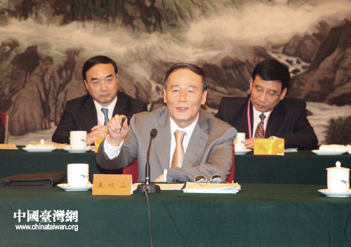 王岐山指出,今年以來,臺灣局勢發生重大積極變化,擴大和深化兩岸經濟交流合作面臨難得的歷史機遇。兩岸在“九二共識”基礎上恢復協商,在“建立互信、擱置爭議、求同存異、共創雙贏”的原則指引下,兩岸周末包機、大陸居民赴臺旅游順利實施。兩岸經濟相互融合日益加深,經濟交流合作不斷擴大。兩岸同胞要抓住機遇,繼續加強經濟文化交流,拓展合作領域,提高合作層次,盡快實現直接“三通”,促進兩岸各領域交流合作邁上新臺階,推動兩岸關系和平發展。