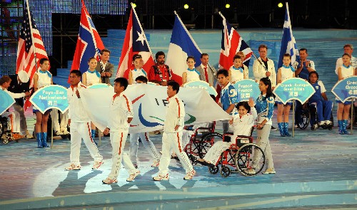 9月7日,在啟動(dòng)儀式上,執(zhí)旗手手持國(guó)際殘奧委會(huì)會(huì)旗入場(chǎng)。 新華社記者 范長(zhǎng)國(guó) 攝