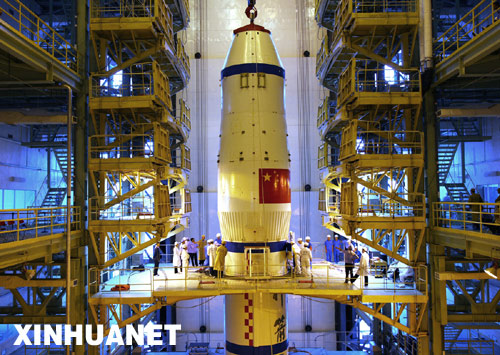 近日,神舟七號飛船完成與長征二號F運載火箭的對接。這是神舟七號飛船與長征二號F運載火箭在垂直裝配廠房進(jìn)行對接。新華社發(fā)(秦憲安 攝)
