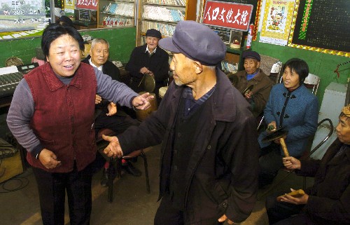 文化館、圖書館等公益性文化單位不斷完善設(shè)施與服務(wù),為群眾準(zhǔn)備豐盛的活動項(xiàng)目;文化共享工程為農(nóng)民群眾拓寬致富路,數(shù)字化放映讓更多農(nóng)民看上好電影;自辦文化大院等群眾自發(fā)文化活動,為基層文化生活增添亮色……十六大以來,我國農(nóng)村文化生活日益豐富,農(nóng)民群眾文化權(quán)益得到保障。 這是2007年11月14日,山西祁縣城趙鎮(zhèn)里村“麻萬全文化大院”的成員正在開展活動(資料照片)。 新華社發(fā)