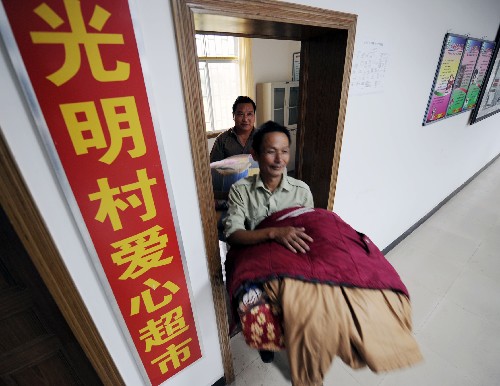 為幫助和救濟(jì)農(nóng)村困難群體,南昌市新建縣自2006年開始在全縣305個行政村陸續(xù)成立了愛心超市,提供米油、棉被、衣服等物品為困難群眾排憂解難,這些物品主要是來自上級民政部門和社會各界的自發(fā)捐贈。 這是新建縣大塘坪鄉(xiāng)光明村的“愛心超市”(10月9日攝)。 新華社發(fā)(周科攝)