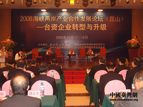 中國臺灣網10月17日昆山消息 “2008海峽兩岸產業合作與發展論壇”今日上午在昆山開幕,活動由昆山市政府、國家科技部海峽兩岸科技交流中心、清華大學臺灣研究所和昆山臺資企業協會共同舉辦。來自兩岸約300位知名企業家和專家學者等各界人士在本次論壇期間,將結合自身實踐和研究成果,共商臺資企業轉型升級與產業轉移。