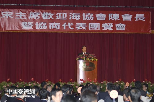 親民黨主席宋楚瑜5日設午宴歡迎海協會會長陳云林及海協會協商代表團一行。這是宋楚瑜在宴會開始前上臺致辭。中國臺灣網 田云鵬攝