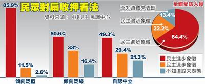 而原陳水扁當局官員及嘉義縣長陳明文、云林縣長蘇治芬涉貪遭收押或起訴,57%民眾認為是司法案件、25%認定是政治案件。交叉分析,政治上傾向綠營、小學文化程度的民眾認為是政治案件的多于司法案件,藍綠民眾看法比扁案分歧。(沈鵬)