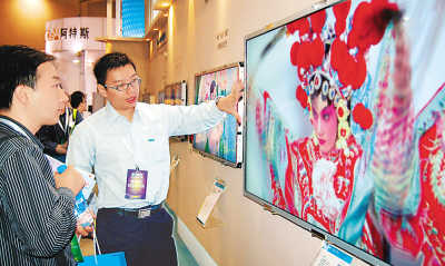 在2008中國(guó)蘇州電子信息博覽會(huì)上,一名工作人員向參觀者介紹超薄新款電視機(jī)。朱桂根攝(新華社發(fā))