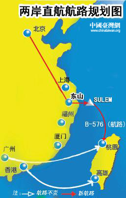 記者了解到,兩岸空中雙向直達航路南線即今年7月啟航的兩岸周末包機航路,北線則是備受關注的“截彎取直”新航路。大陸航班循新航路在飛至浙江東山上空后,往東飛經兩岸航空管制交接點SULEM(北緯 27°26′20″、東經 122°25′19″),再繼續往東飛至B576航線,沿B576航線抵達臺北。新航路(東山-臺北)全程僅為276公里。